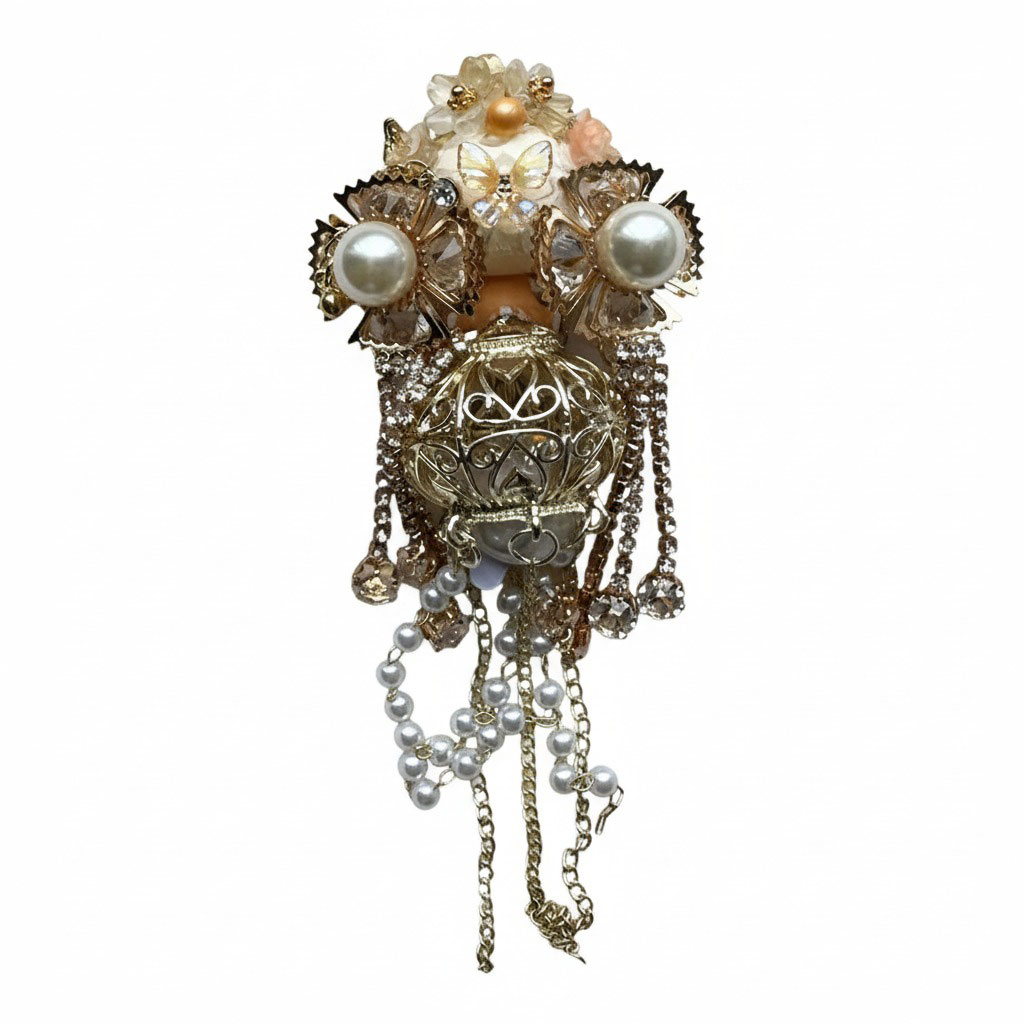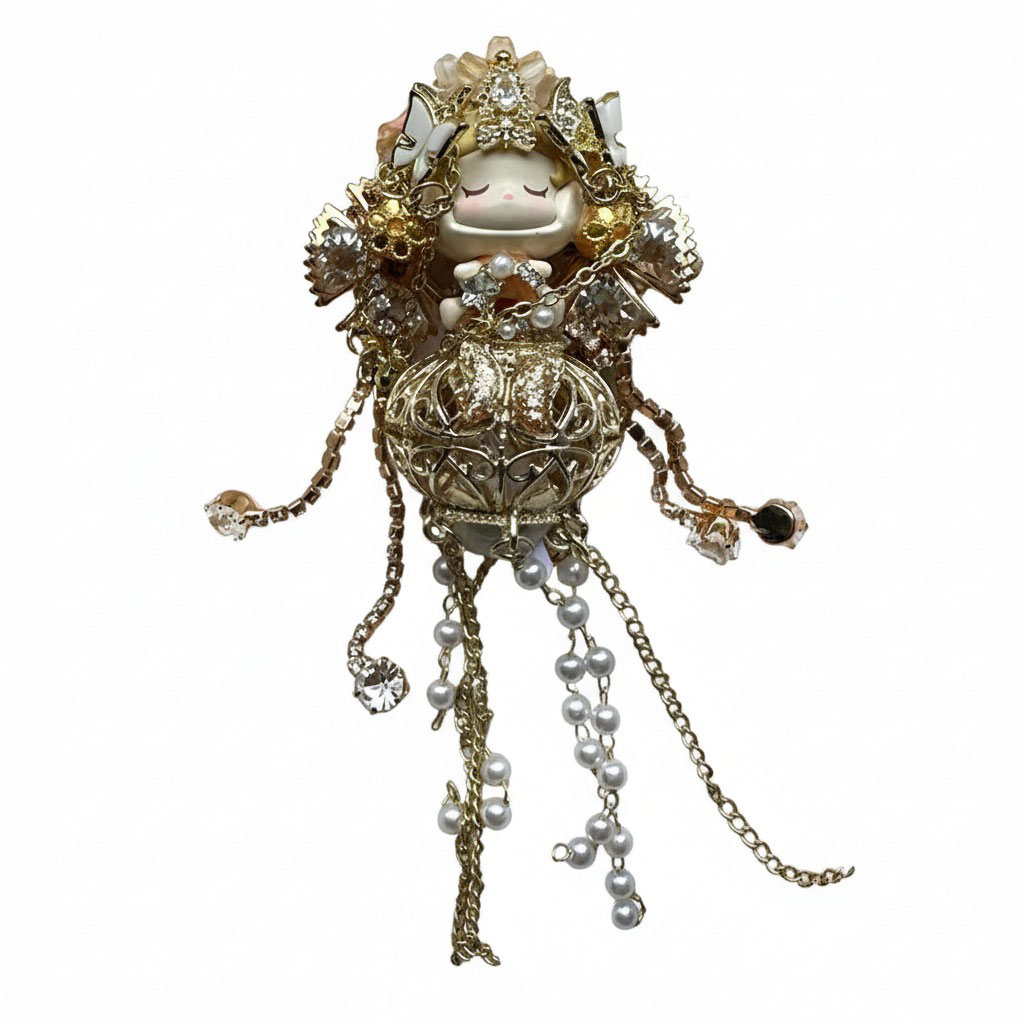 Haar outfit is rijk gedecoreerd met vlinders, parelmoer accenten en een hangers. De combinatie van zachte kleuren, glanzende details en het werkende licht maakt haar tot een uniek centerpiece in elke collectie.