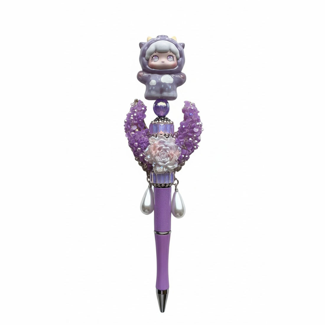 De DreamPop Luna Bao Figuurpen is een pen die speelsheid en glamour combineert. Bovenop zit een figuurtje uit de Baobao serie, geplaatst op een maan kraal vol glitter en op de achterzijde zilver/paarse vleugels. De pen is perfect als cadeau voor haar, voor verzamelaars of liefhebbers van bling.