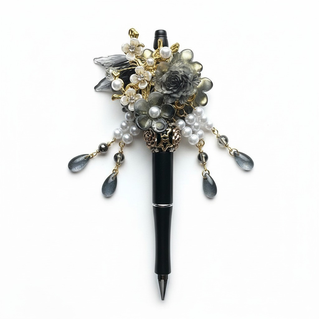 Een luxe bloemenpen in zwart en goud, met parels en sierlijke hangers. Midnight Bloom straalt mystiek, elegantie en handgemaakte charme uit