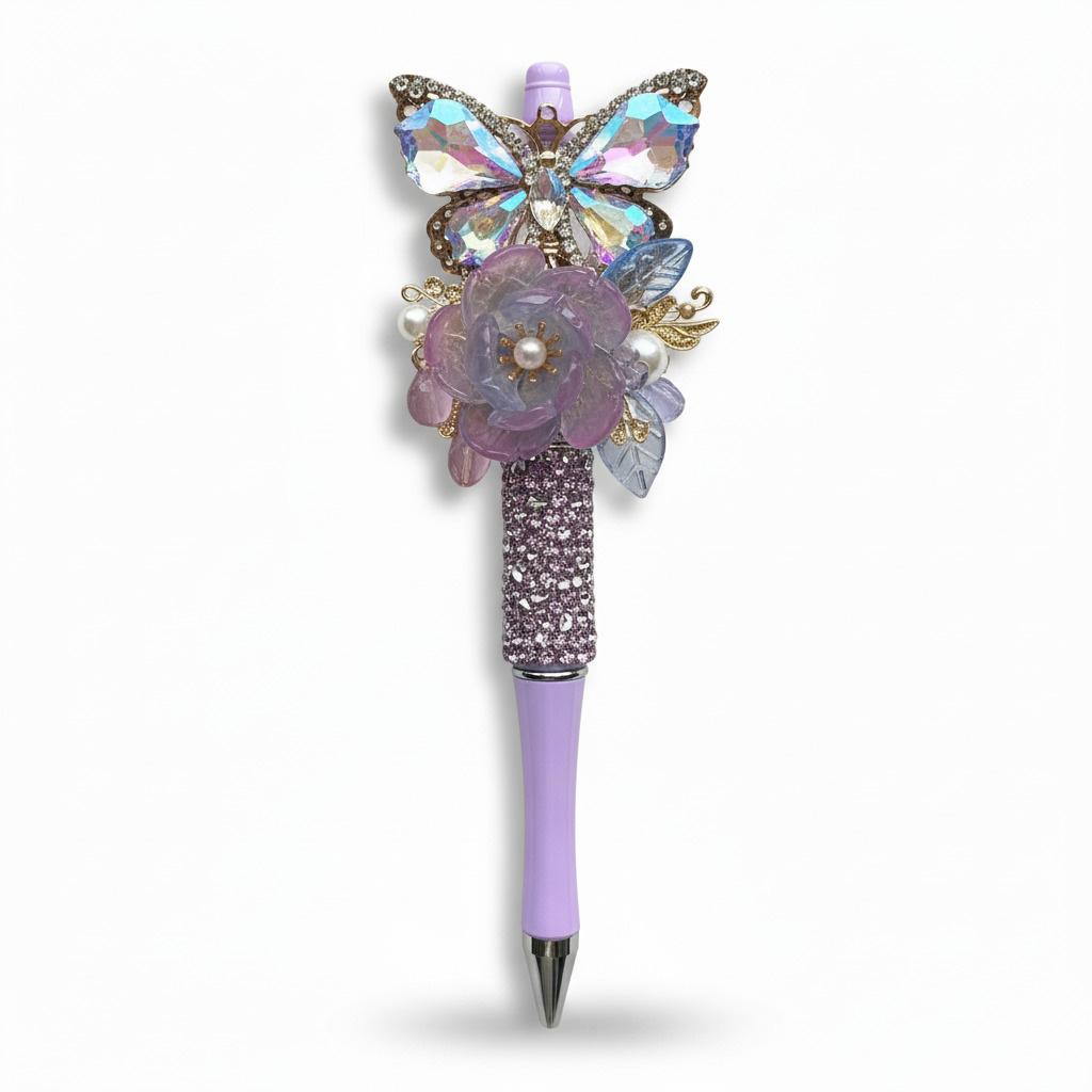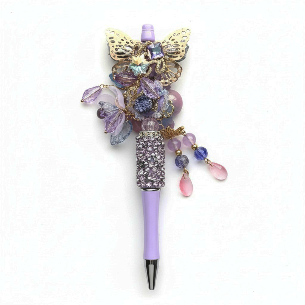 Laat je schrijfmomenten fladderen met de Butterfly Bloom Bloemenpen. Deze handgemaakte pen combineert een elegante paarse bloem met een sierlijke vlinder en glinsterende steentjes. De Fantasy Bloom-stijl brengt een vleugje magie naar je bureau, bullet journal of cadeauverpakking.