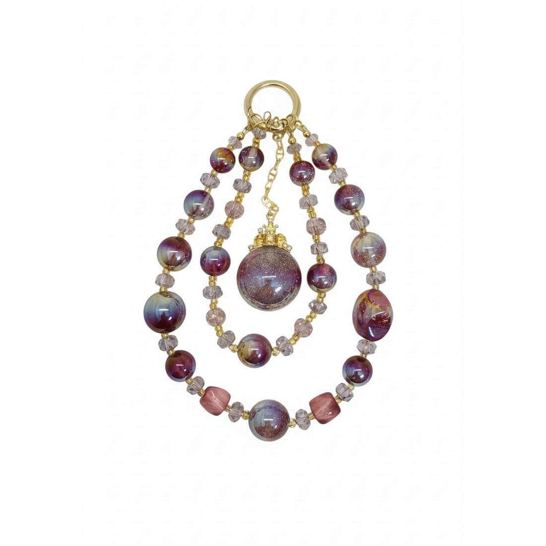 Een keychain met een centrale roodkleurige galaxy kraal met kasteeltopper. De omliggende kralenstrengen zijn versierd met galaxy en schitterende kralen in kleiner formaat.