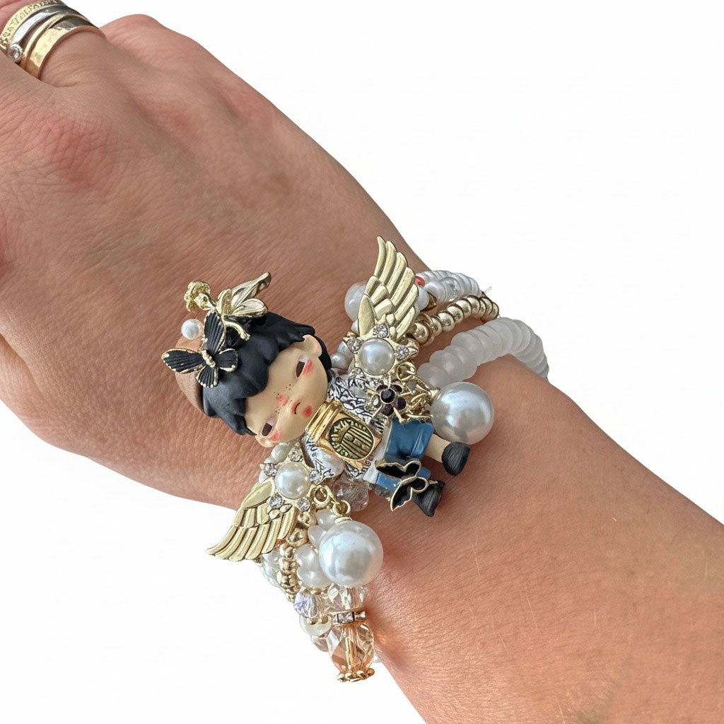 Vier elastische armbanden, zorgvuldig gecombineerd tot één uniek geheel. In het midden een gevleugeld Hirono figuur. Subtiel, stoer en stijlvol. Draagbaar, comfortabel en met een vleugje bling: Deze armband is een statement zonder woorden. Perfect om te mixen, matchen of solo te dragen.
