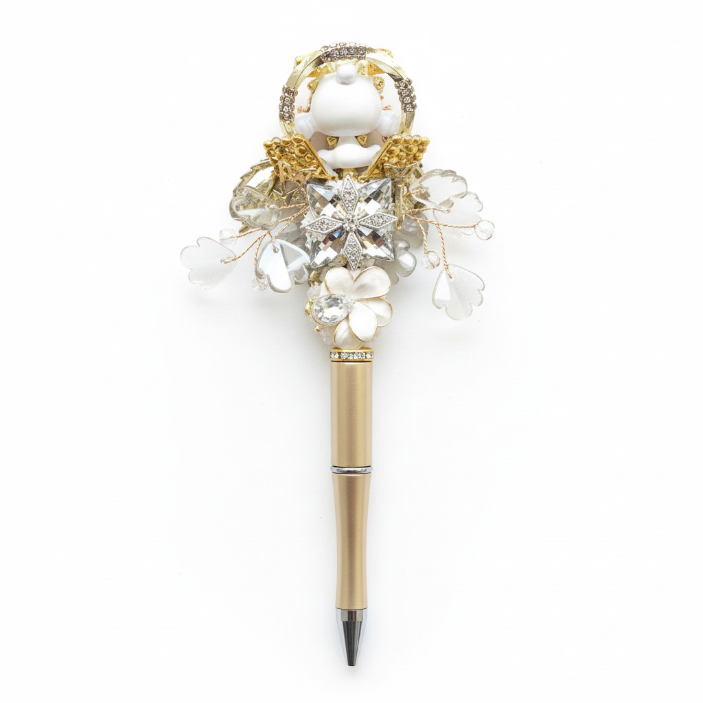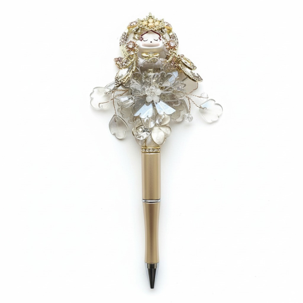 De Crystal Bloom Sprite is een handgemaakte pen die betovert met haar delicate details. Bovenop prijkt een Mini SP figuurtje met een glimlach, omringd door transparante bloemen, parels en glinsterende kralen. De gouden accenten en zachte kleuren maken deze pen tot een visueel juweeltje.