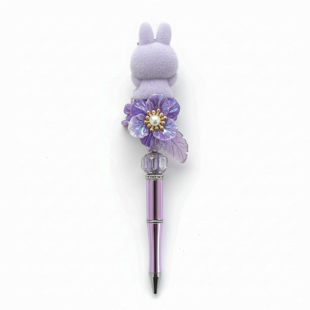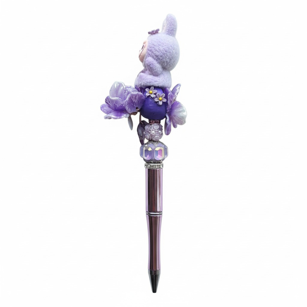 Deze unieke handgemaakte pen is een echte showstopper. De paarse Bubu-figuur wordt omringd door een volledig handgemaakte bloemenkraal, waarin een subtiel lichtje verborgen zit. Door het witte labeltje te verwijderen en terug te plaatsen, kun je het licht aan- en uitzetten. Een magisch detail dat deze pen tot een waar pronkstuk maakt.