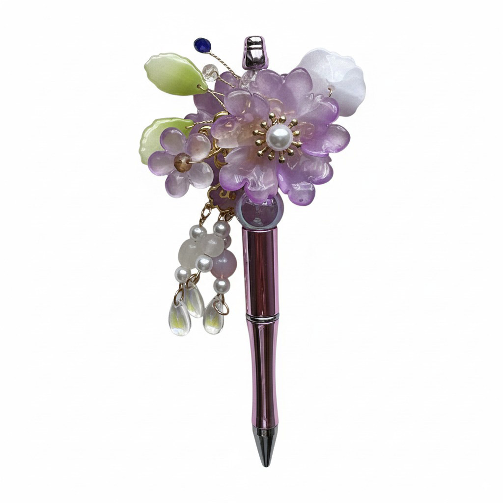Pearl Dew Charm is een sierlijke bloemenpen die opvalt door haar verfijnde afwerking en speelse details. De pen heeft een metallic roze basis en is versierd met een bloemtopper van paarse bloemblaadjes. In het midden schittert een parel. Aan de bloem hangen decoratieve ornamenten in parel- en druppelvorm. Pearl Dew Charm schrijft soepel met zwarte inkt en is perfect als cadeau, voor journaling of als blikvanger op je bureau.