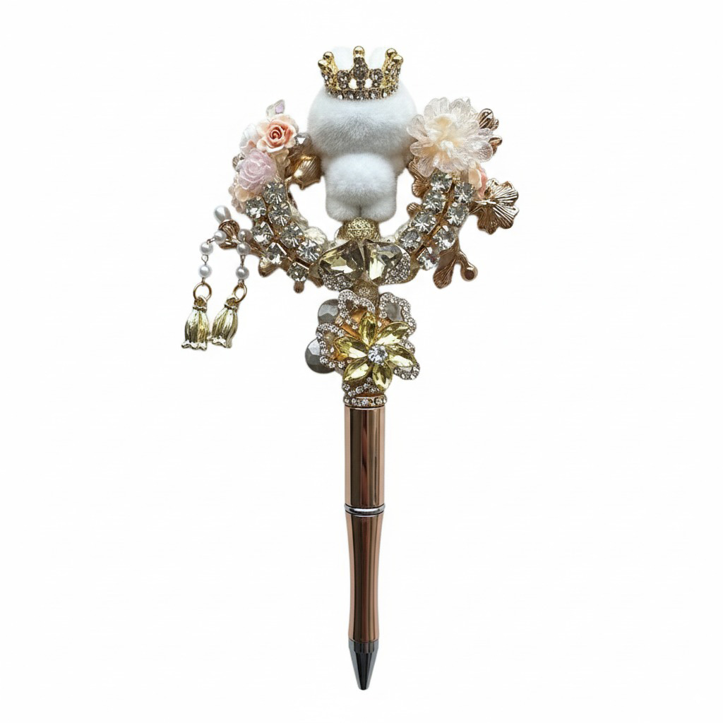 De Royal Moonbloom is een handgemaakte pen die elegantie en speelsheid samenbrengt. Bovenop prijkt een witte bubu met een kroontje, zittend op een goudkleurige maan. De pen is rijkelijk versierd met bloemen, parels en fonkelende details. Een sprookjesachtig kunstwerkje dat schittert op elk bureau of in een vitrine.